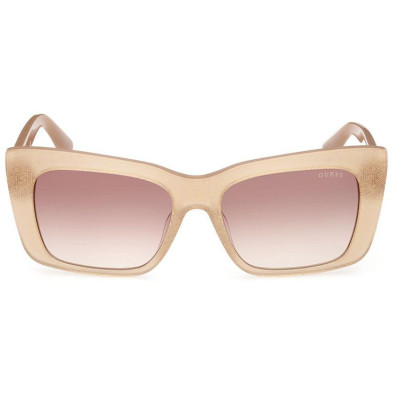 Gafas de sol GU7890 57F 140 mm. Gafas de sol de mujer de forma rectangular. Montura de plástico de color beige brillante y cristales color marrón degradado. Ancho de puente 17 mm, calibre (diámetro cristal) de 55 mm y patilla de 140 mm.