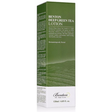 DEEP GREEN TEA lotion de BENTON. La composición de este hidratante de textura ligera contiene un 50 % de té verde de Boseong, la región en la que se produce el té más famoso de Corea. Esta loción ligera refresca e hidrata la piel. Es apta para piel normal y grasas.