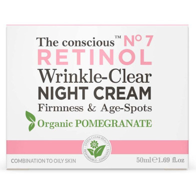 The conscious™ Crema de noche antiarruga para una transformación nocturna con retinol renovador de la piel y aceite de granada orgánico hidrata profundamente la piel y suaviza su textura para combatir los signos del envejecimiento y restaura una apariencia y sensación claras, firmes y rejuvenecidas.