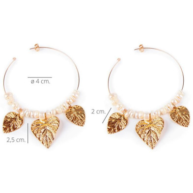 Destaca por ser un modelo único y singular que no pasará desapercibido, se basa un f ino aro de 4 cm de diámetro del que cuelgan un clúster de pequeñas y redondas perlas de río junto con tres hojas con armoniosas curvas y suaves líneas perfectamente marcadas, dándole relieve y textura, la hoja central mide 2,5 cm y las laterales 2 cm de largo. Es un pendiente de grandes dimensiones con un diseño muy particular.